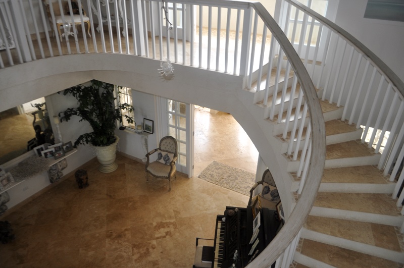 To describe this property as “simply paradise” just gives one a glimmer of its true character. Owner conceptualized and built, this 4 bedroom, 5 bathroom luxurious villa is approximately 5 years old and in impeccable condition. It offers a two storey main house with two annexes one to the North-East and one to the South-West. Upon entering the enclosed yard towards the North of the property one notices the façade of this beautiful residence, the flow from the courtyard to the columned covered terrace and its wrap around patios and the two annexes is just an indication. The main entrance to the house is through a grand foyer which boasts of an elegant stairwell with white balustrades trimmed with pickled pine. Towards the East one has the entertainment/bar area inclusive of circular bar and three sets of double French doors. Towards the South and separated by Roman influenced columns is the open plan living and formal dining area complete with lovely double French doors which lead onto the wrap around patio and additional covered terrace facing the gorgeous views of the Atlantic Ocean. Set within a private oasis towards the East of the property is the generous sized pool, easily accessible from the bar, living areas or annex this space will also prove to be a high activity area loaded with fun. Towards the South-Western side of the foyer one has the powder room and the well-functioning kitchen. The kitchen offers a dishwasher, Bosch Induction hub, well-crafted cabinetry with granite countertops, center island with electric stove top and breakfast bar ensemble. A very cool environment, the kitchen also has double French doors facing the South-West which open onto the covered breakfast nook and overlooking the bar-be-que area. Also, towards the North West of the kitchen is access to the wrap around patio leading to the annex on the South-West. This annex offers a sizeable office which can also act as a fifth bedroom should this be desired, the laundry with full bathroom and shower, separate storage and two car covered garage. There is a water tank facility built under the garage area as well. The upper level offers three of the bedrooms, the impressive Master bedroom is towards the center of the villa or South of the property. It has an en-suite bathroom with his and hers vanity, Jacuzzi tub and dual showers. There is also a separate walk-in his and hers closet with built in vanity. Towards the West and East are the three remaining bedrooms with built-in closets and en-suite bathroom with shower. Towards the North of the property on this level is a covered terrace overlooking the gardens below. The annex towards the North-East is of an open-plan concept, has a private patio with direct access to the pool and parking. It has the facility for a kitchen and stackable washer dryer which makes this into a private residence. The bedroom is equipped with built in closets and faces the ocean, the bathroom is in the hallway and finished with a shower. This relaxing a homely property is very comfortable and easy flow. Finishes include stainless steel high grade 370, travertine tiles throughout, air-conditioning in all bedrooms, fully secure with alarm system and two solar water systems. The use of natural hues, French doors, coral stone rendering, scounces and well-designed layout all add to make this home where one is greeted into a tranquil ambiance and embraced by breathtaking views in nearly every room. Deborah Bay is a mere cliff walk away. Words cannot describe “simply paradise”, it has to be experienced. Being sold with appliances. EO&E.